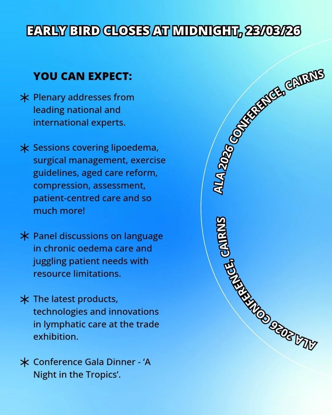 Whether an experienced practitioner, a passionate researcher, or new to the field, you will find that the 2026 ALA Conference will offer something for everyone, uniting our community in the pursuit of better outcomes for those living with lymphoedema and lymphatic conditions.